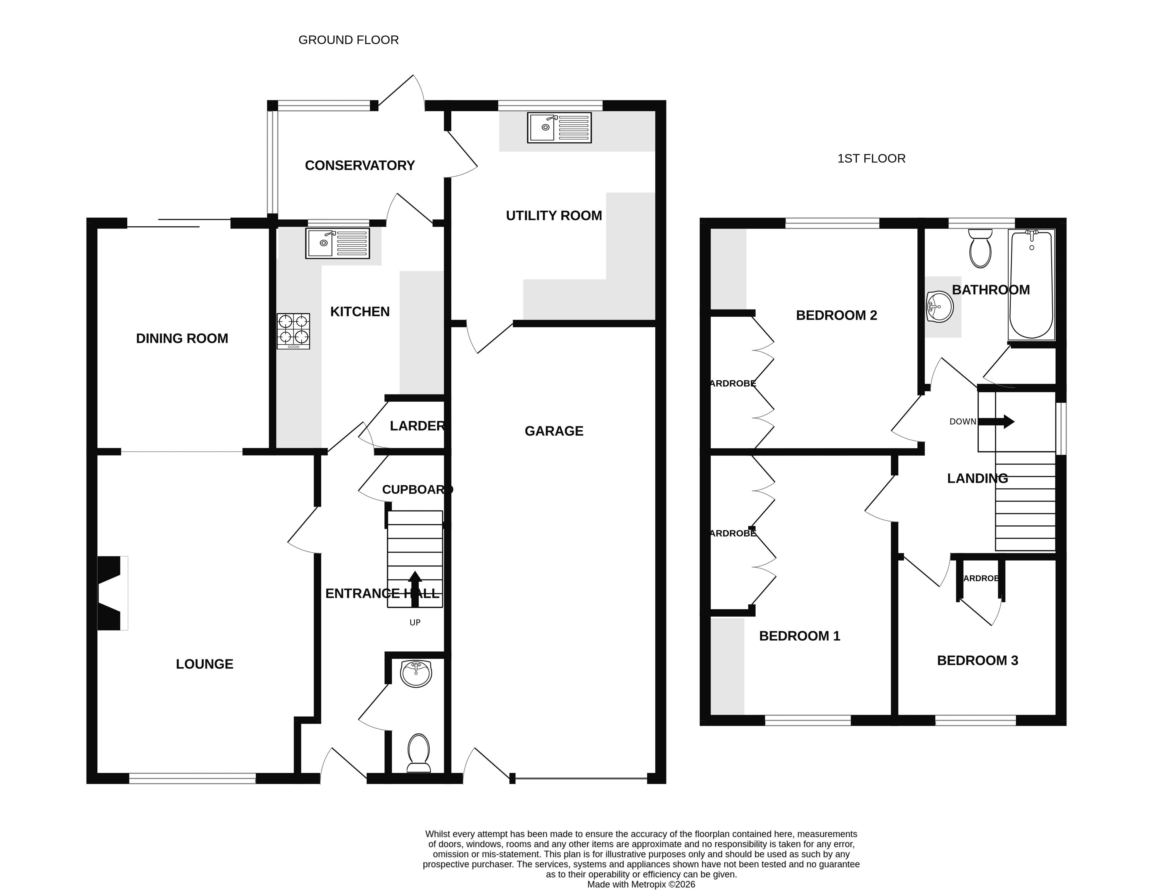 Rear aspect double glazed window and door to conservatory, range of fitted eye and base level units with worktops over, tiled splash backs larder with automatic light, under lights, space for fridge/freezer, single sink with mixer tap, display unit, space for cooker with extractor hood over, coved and smooth ceiling.